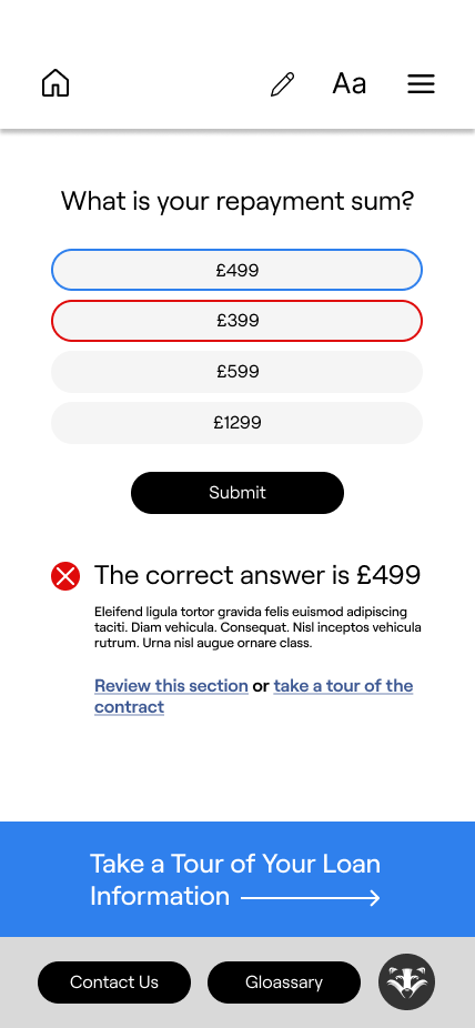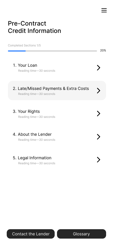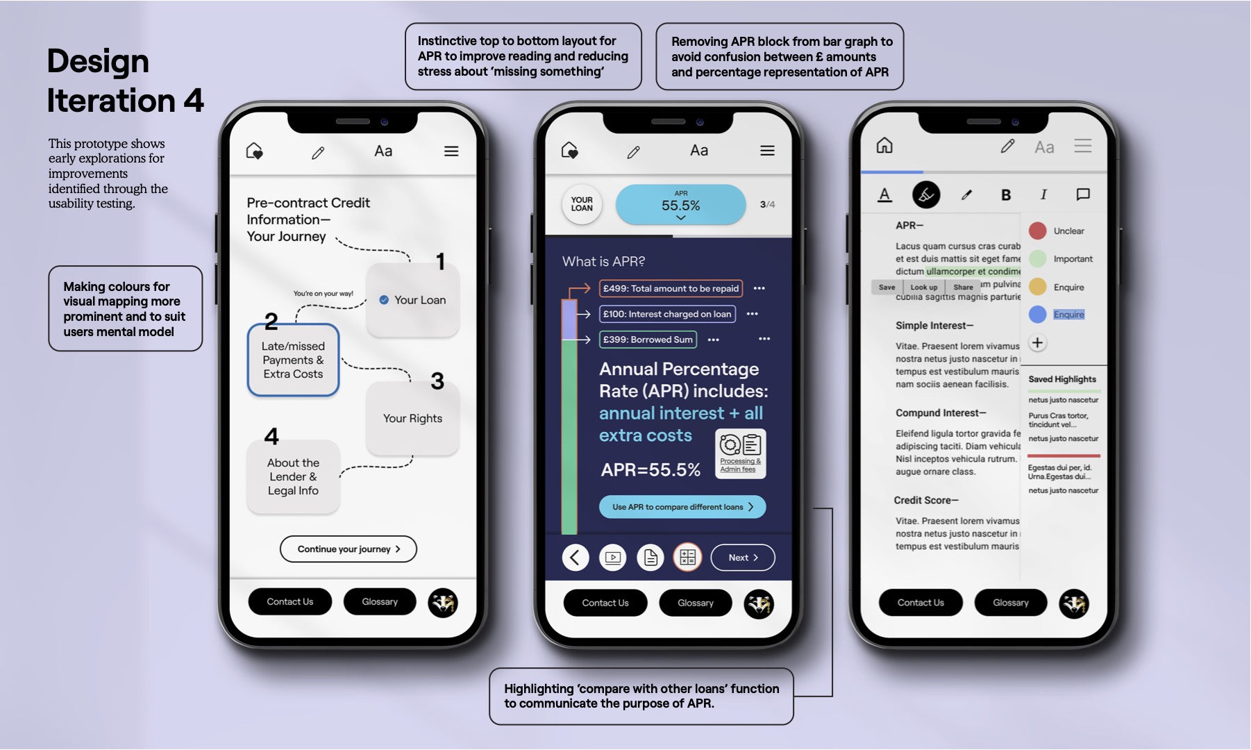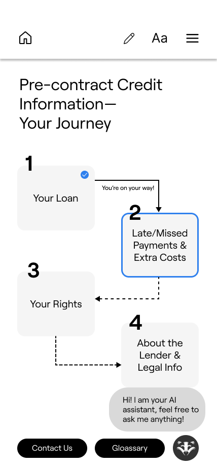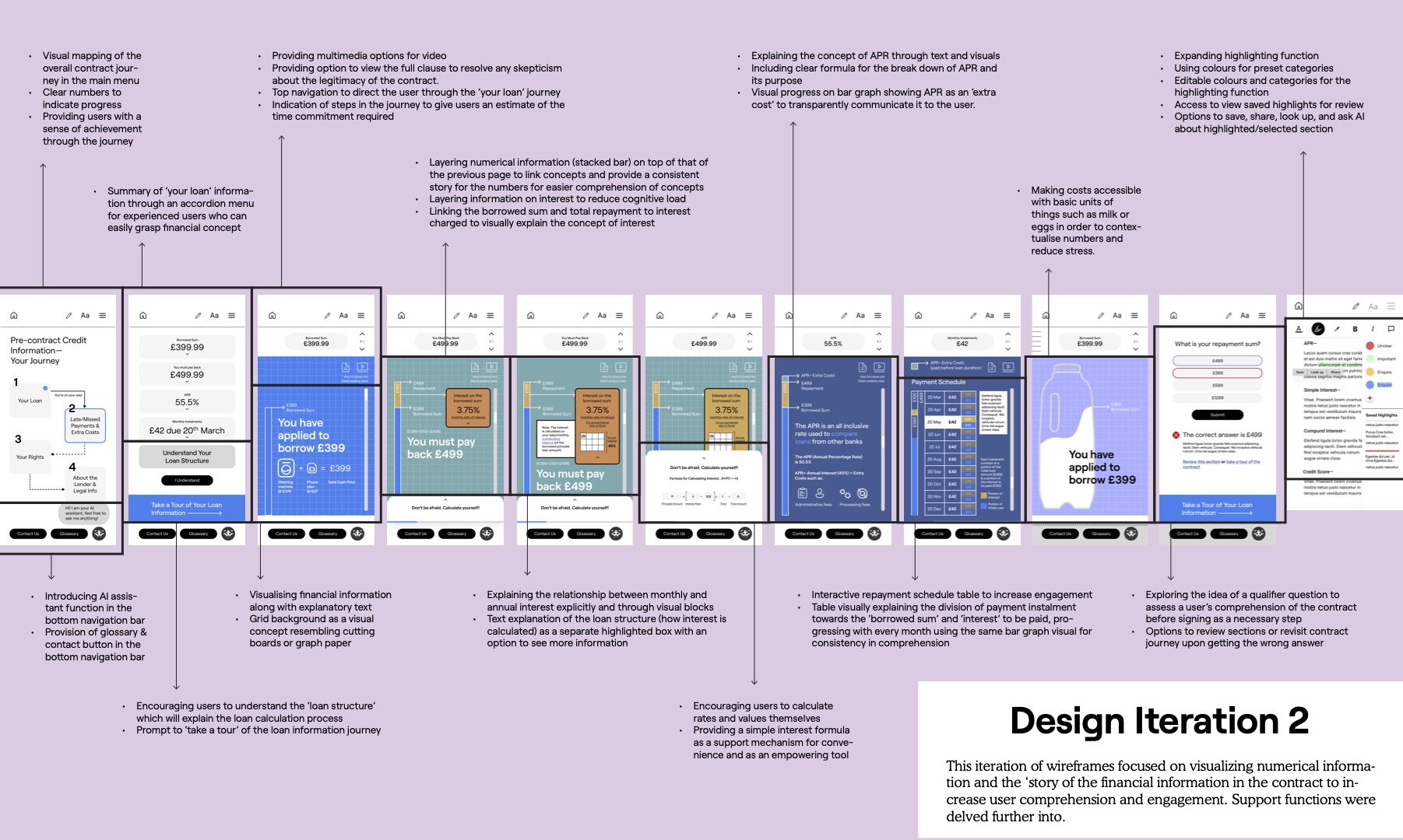 The contract journey was mapped with clear progress indicators and visual layers, such as bar graphs and interest breakdowns, to reduce cognitive load. Financial figures were contextualised using relatable everyday units. Interactive tools—including calculators, repayment tables, and qualifier questions—were introduced to support informed decision-making. Key features like an AI assistant, glossary, and clause access were integrated, along with highlight, save, and share options to give users greater control and recall.