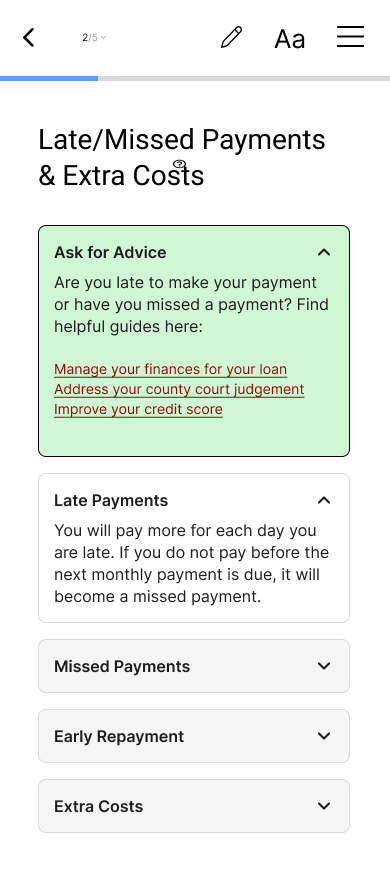 Contract information was restructured for clarity and relevance, supported by visual tools like loan timelines, repayment tables, and an in-app calculator. Progressive disclosure, glossaries, and layered explanations helped simplify complex content. Readability was enhanced through customisable text and highlight/save functions. The design also introduced support flows for missed payments, early repayment, and additional costs, while offering reassurance through direct lender contact and contextual guidance.