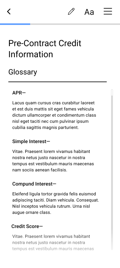 An investigation into on-screen versus print consumption of text showed that, particularly in the case of task focused reading, reading printed text led to greater comprehension and more focused reading (Delgado & Salmerón, 2021). Further, as studied by (Liu, 2021) on-screen reading resulted in a lack of focus due to distraction and multi-tasking behaviours.Such strategies and patterns must be considered when designing a digital solution for financial contracts.