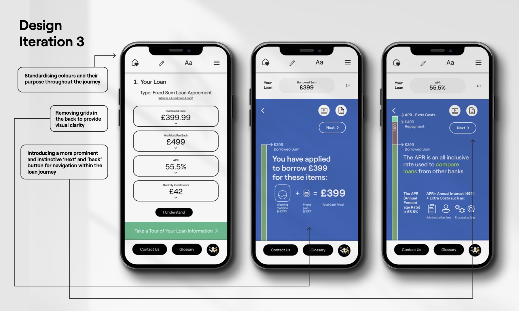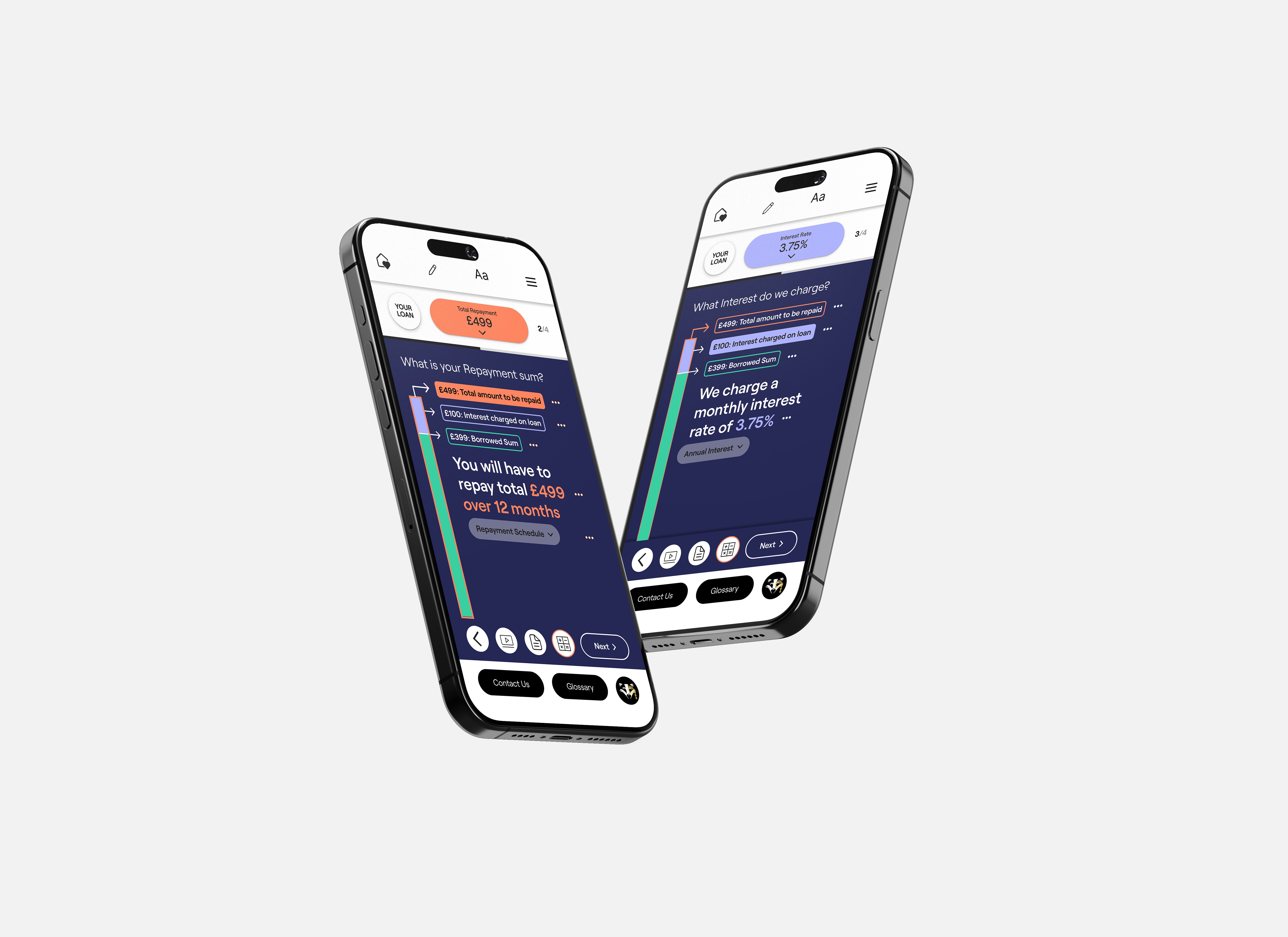 Explore designs for a mobile application interface with a focus on key features of the loan product and consequences. Re-group information by importance and logic, while addressing information gaps through layers. Visually map the journey of the numerical information in the loan to increase comprehension of and engagement with the information, whilst reducing anxiety. Explore support mechanisms that can reduce anxiety about math and consequences/debt and increase ease of comprehension and engagement.