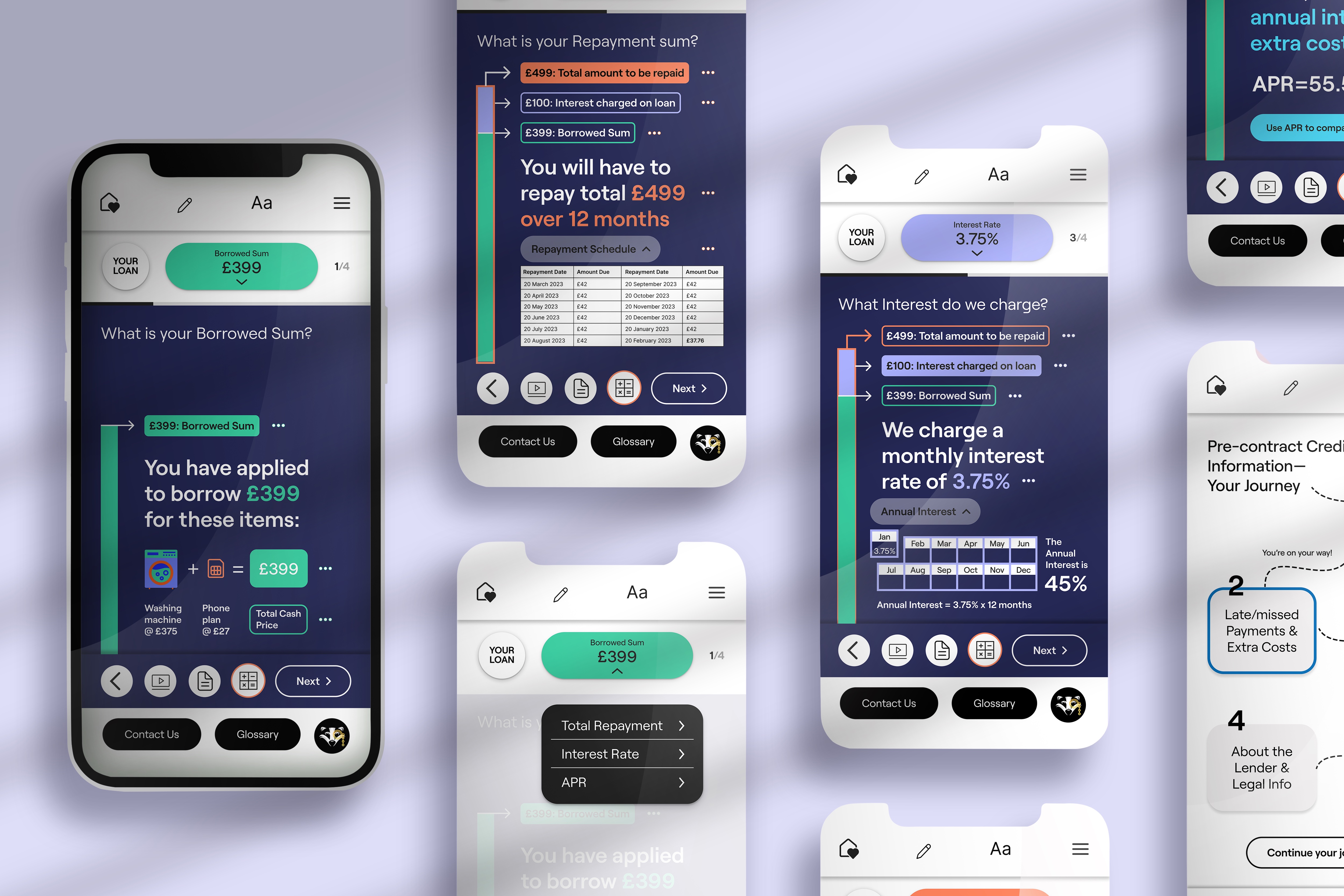 Designing layered visual contracts to help users better understand and engage with credit contracts. The design explorations focus on communicating financial concepts, increasing user confidence with calculations, and building trust towards financial intuitions/banks.This study will focus on literate adults in the UK as a target user group.