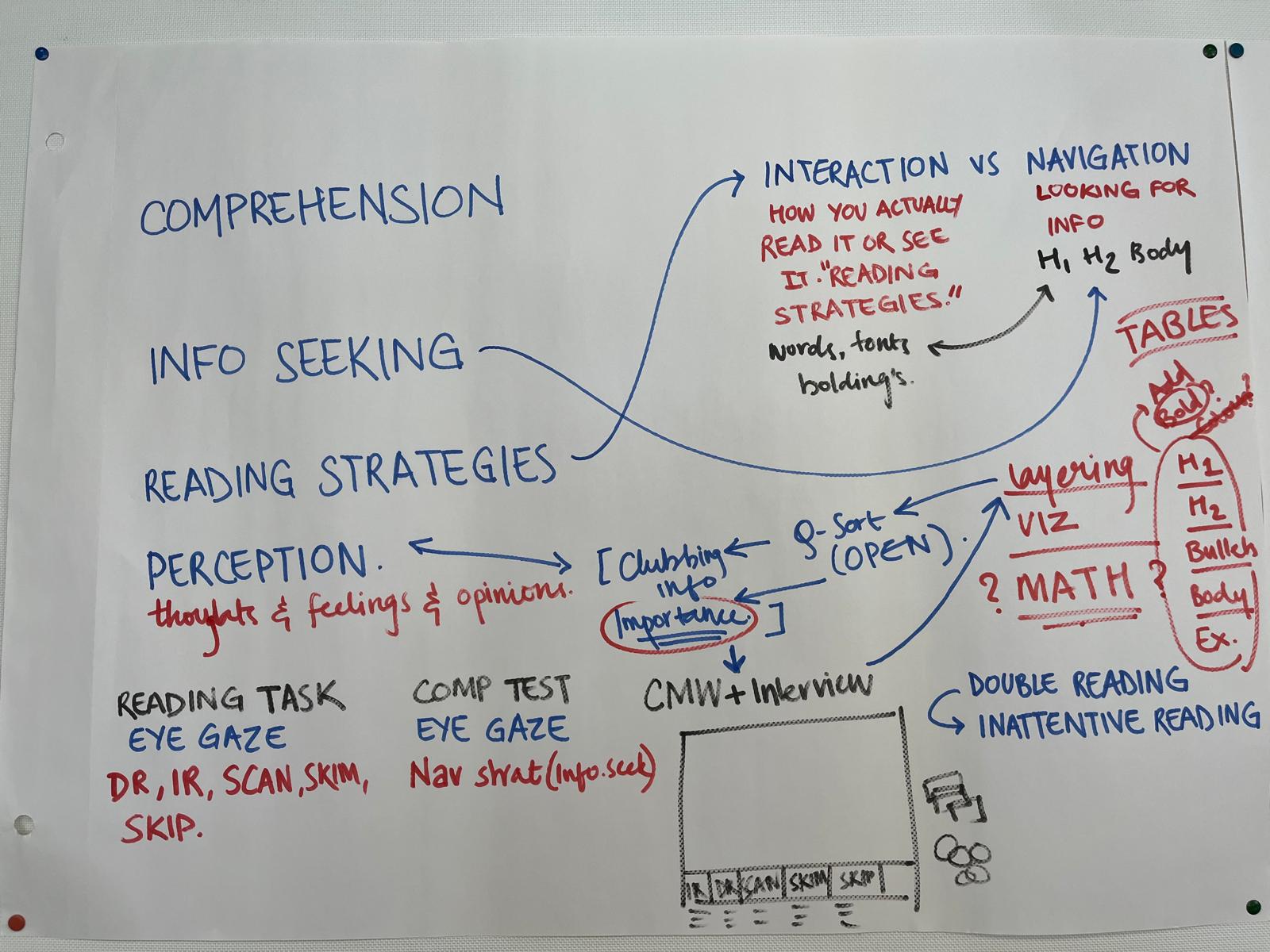 To understand how users consume a large piece of text. Looking for reading behaviours such as double reading, scanning, and skipping text through eye-gaze tracking. Measured additionally via interview questions in the cognitive mapping workshop.