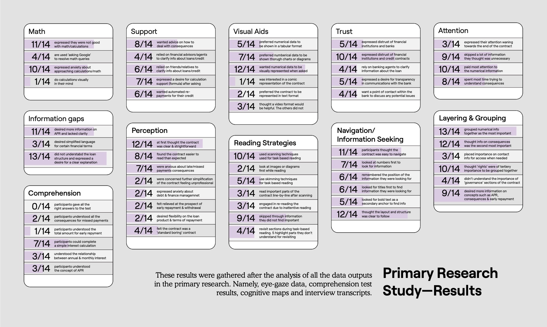 To understand how comprehendible the sample financial contract is. Particularly to understand user comprehension of interest rate and loan structure. Measured through the comprehension test and cognitive mapping workshop.