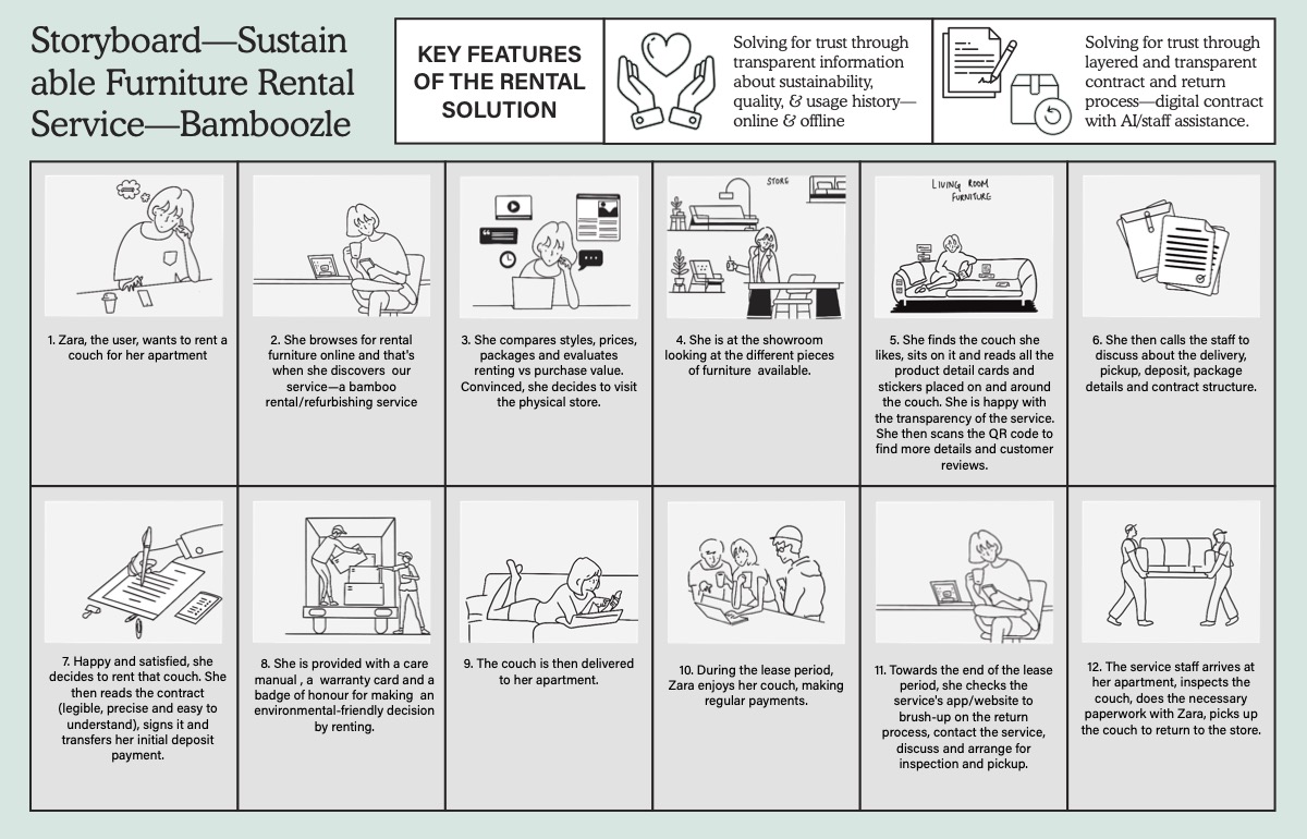 These methods resulted in creating a concept of bamboo furniture renting and refurbishing online and offline service with a focus on fostering trust through transparent communication of information on sustainability and quality of its products.