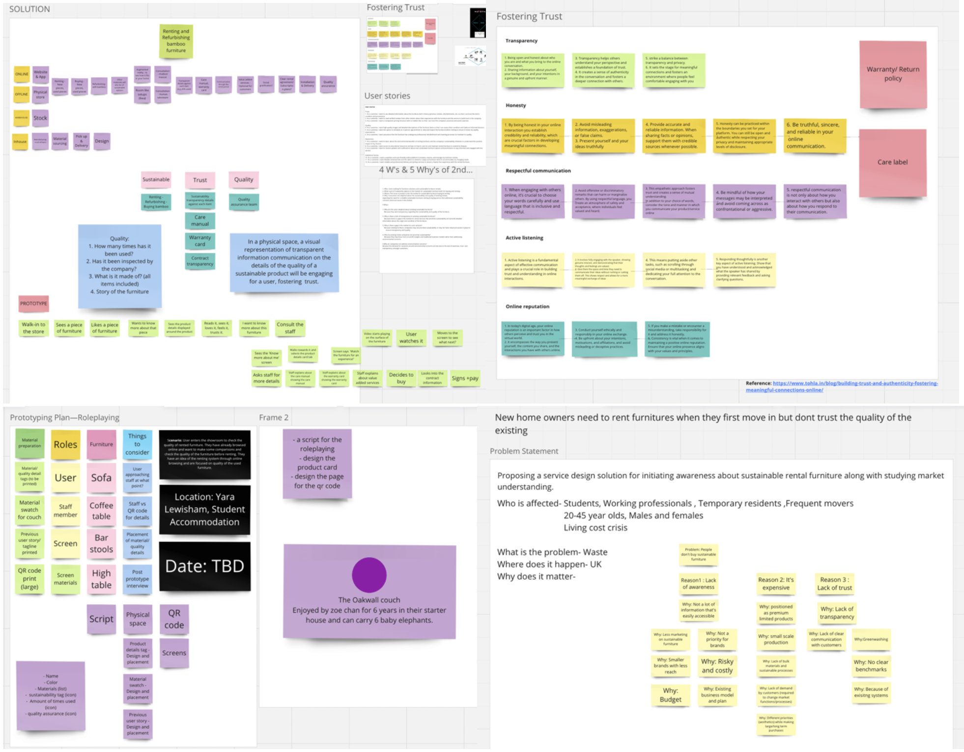 An exploratory study on how we might encourage 20–45-year-old UK residents to lower ecological footprint lifestyle changes amid the cost-of-living crisis led to secondary research about the sustainable furniture market in the UK. It led to further exploring people’s attitudes towards buying sustainable furniture and the factors influencing their decision in the current cost-of-living crisis through a survey and interview, analysed through quantitative and thematic analysis (Hollway and Jefferson, 2000). A competitor analysis followed to assess the strengths, weaknesses, and strategies of existing sustainable furniture services (Bensoussan, 2003). The findings from these methods were clearly defined into a report resulting in the framing of an initial problem statement from the 5 Why’s method to understand the root cause of the problem and 4 W’s method to make sure we have understood enough of it.